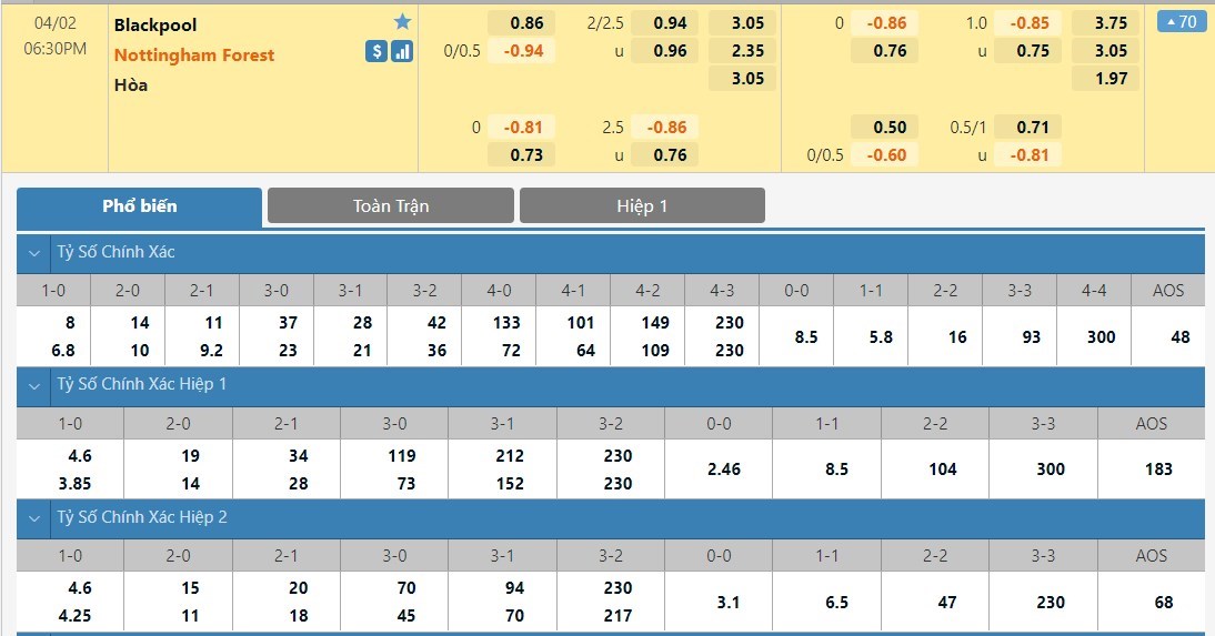 Tip kèo tỷ số hiệp 1: Blackpool 0-1 Nottingham Forest