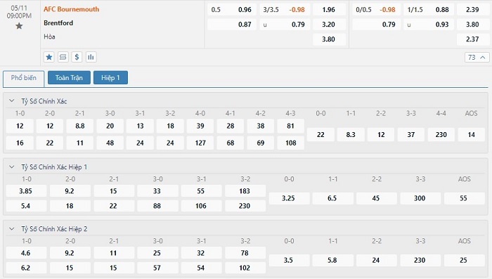 Tip kèo tỷ số hiệp 1: Bournemouth 1-1 Brentford