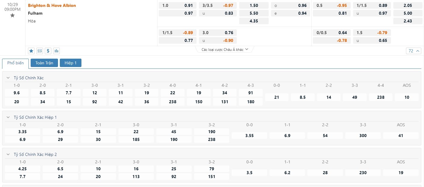 Trong 5 trận đấu gần nhất của mình, Brighton chỉ có 1 trận đấu mang về được cho mình ít nhất là 1 bàn thắng trong hiệp đấu đầu tiên. Còn với Fulham, đội bóng này đã có 2 lần làm được điều này trong 45 phút đầu tiên. Với tỷ lệ kèo hiệp 1 là Brighton chấp -1/2 trái thì các nhà đầu tư nên tin tưởng vào cửa dưới ở trong hiệp đấu đầu tiên này.