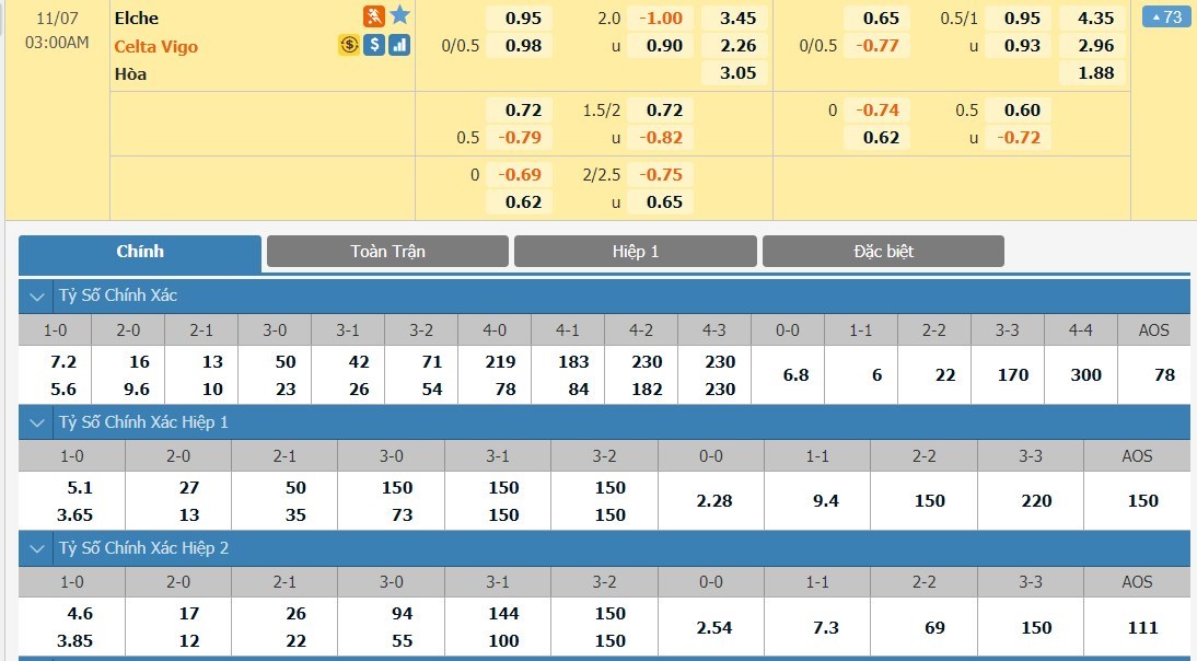 Tip kèo tỷ số hiệp 1: Elche 0-0 Celta Vigo