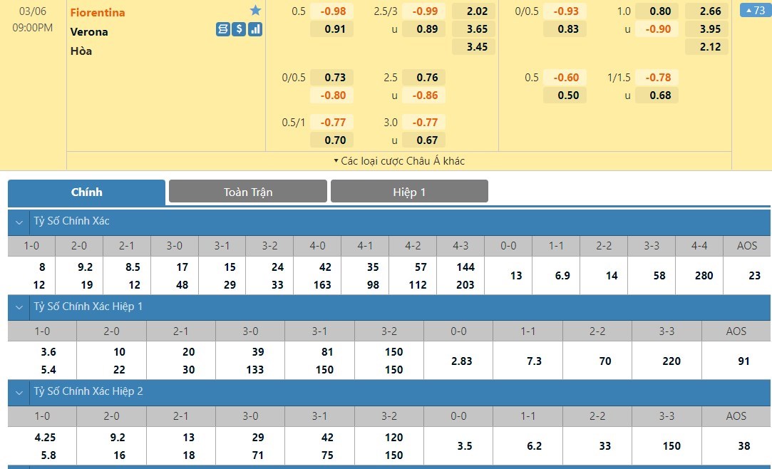 Tip kèo tỷ số hiệp 1: Fiorentina 0-0 Hellas Verona