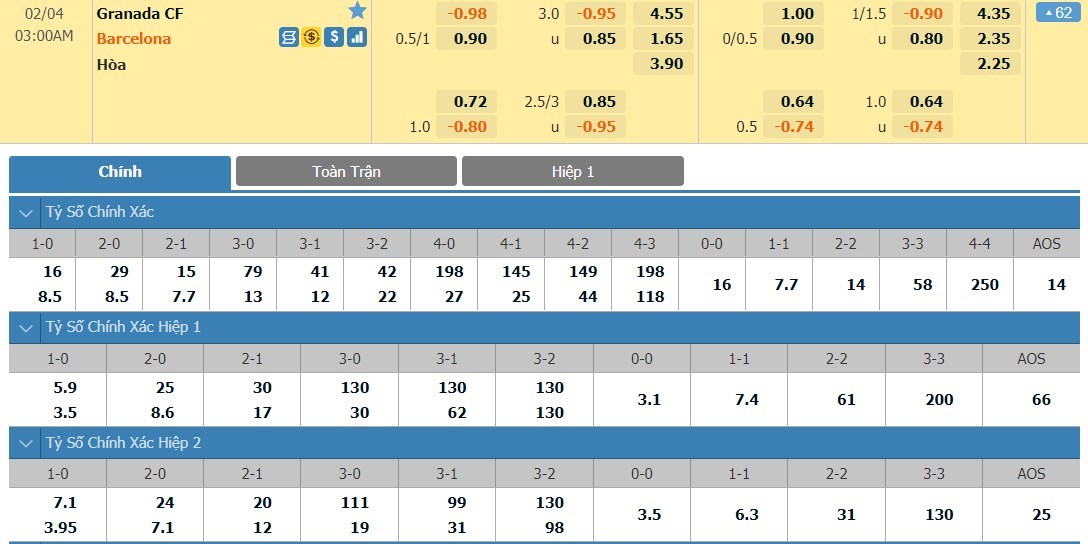 Tip kèo tỷ số hiệp 1: Granada 0-1 Barcelona