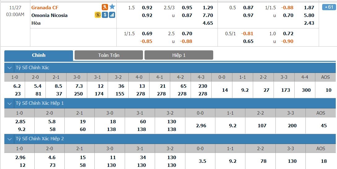 Tip kèo tỷ số hiệp 1: Granada 1-0 Omonia Nicosia