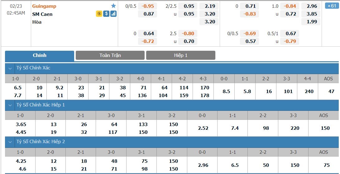 Tip kèo tỷ số hiệp 1: Guingamp 0-0 Caen