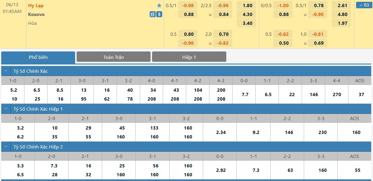 Tip kèo tỷ số hiệp 1: Hy Lạp 1-0 Kosovo