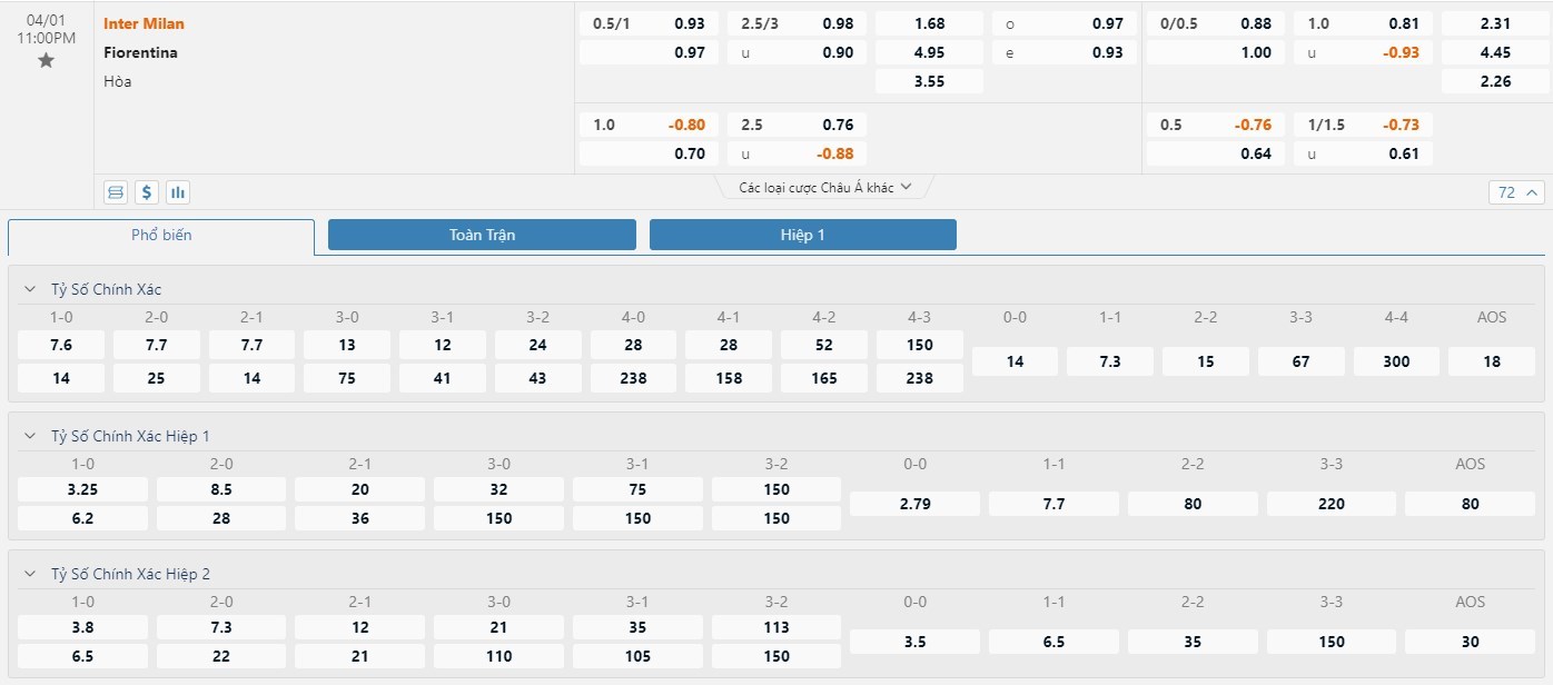Tip kèo tỷ số hiệp 1: Inter Milan 1-0 Fiorentina