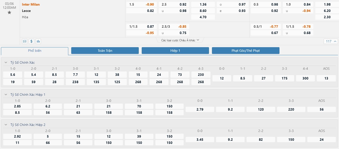 Trong 5 trận đấu gần nhất đôi bên đụng độ nhau trực tiếp, Inter Milan đã có 4 trận đấu mang về được cho mình ít nhất là 1 bàn thắng trong hiệp đấu đầu tiên. Còn với Lecce, đội bóng này đã có 2 lần làm được điều này trong 45 phút đầu tiên. Với tỷ lệ kèo hiệp 1 là Inter -1/2 trái thì người chơi nên tin tưởng vào đội chủ nhà trận này. Ở 5 lần đối đầu trực tiếp nhau thì đã có 3 trận đấu kết thúc với tổng số bàn thắng từ 3 trở lên. Các nhà đầu tư nên tin tưởng vào khả năng nổ Tài ở cuộc đối đầu này với tỷ lệ tài xỉu là 2 1/2 trái.