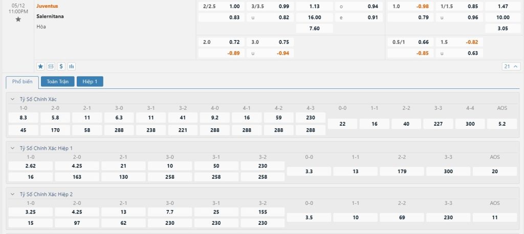 Juventus nhận được đánh giá rất cao từ phía đội ngũ chuyên môn với mốc chấp -2 1/4 trái trận đấu này. Rõ ràng là xét trên mọi khía cạnh thì Salernitana đều thua kém rất nhiều. Hơn nữa, việc Juventus chơi trên sân nhà càng gia tăng thêm niềm tin vào một chiến thắng dành cho Lão Phu Nhân. Họ đang sở hữu chuỗi 6 trận liên tiếp bất bại trên sân nhà, trong đó có 3 chiến thắng. Khi mà đội khách đã chẳng còn chút động lực chiến đấu thì có lẽ đây sẽ là một trận đấu dễ dàng dành cho Juventus. Trong 6 lần chạm trán gần nhất giữa hai đội thì có tới 5 chiến thắng thuộc về Juventus. Rõ ràng là chẳng có cơ sở nào để hy vọng vào một kết quả khả quan dành cho đội khách. Cả 4 lần đụng độ gần nhất giữa hai đội bóng này đều xuất hiện từ 3 bàn trở lên.