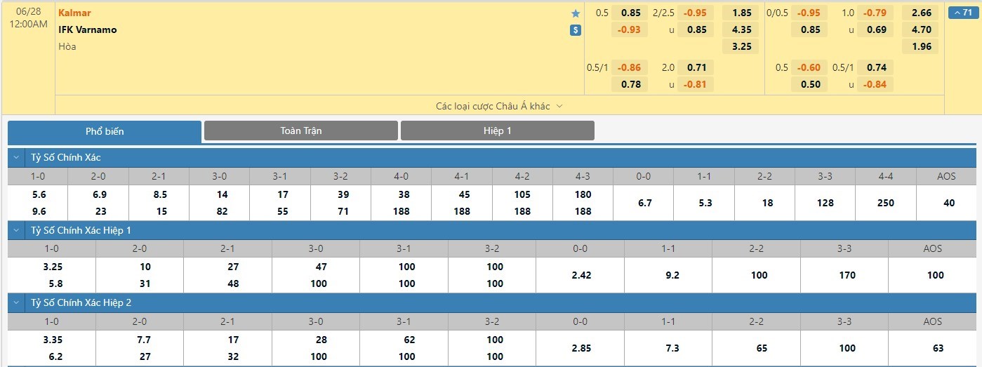 Tip kèo tỷ số hiệp 1: Kalmar 1-0 Varnamo