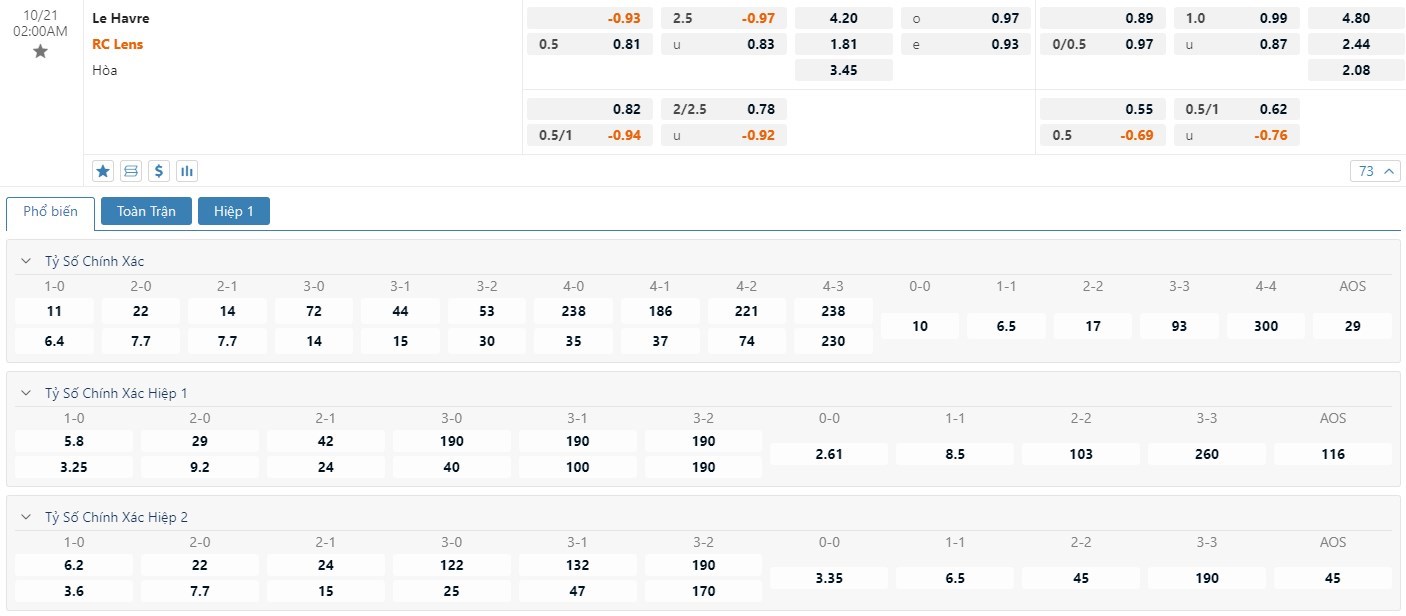 Trong 5 trận đấu gần nhất của mình, Le Havre chỉ có 1 trận đấu mang về được cho mình ít nhất là 1 bàn thắng trong hiệp đấu đầu tiên. Còn với RC Lens, đội bóng này đã có 4 lần làm được điều này trong 45 phút đầu tiên. Với tỷ lệ kèo hiệp 1 là RC Lens -1/4 trái thì các nhà đầu tư nên tin tưởng vào đội chủ nhà ở trong hiệp đấu đầu tiên này. Trong 5 trận đấu gần nhất trên mọi đấu trường, Le Havre đã mang về cho mình 5 pha lập công cùng với việc đã có 6 lần phải vào lưới nhặt bóng. Bên kia chiến tuyến, RC Lens đã sở hữu 7 bàn thắng, còn lại là việc hàng thủ đã phải nhận 4 bàn thua. Các nhà đầu tư nên tin tưởng vào khả năng ra cửa Xỉu ở cuộc đối đầu này với tỷ lệ tài xỉu là 2 1/2 trái.