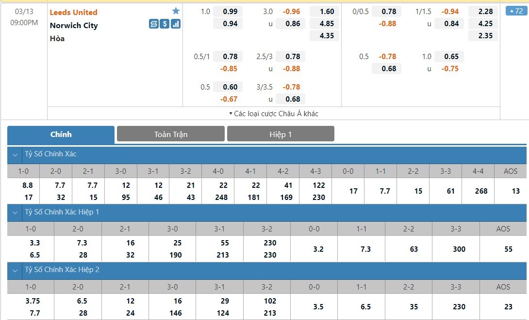 Tip kèo tỷ số hiệp 1: Leeds 0-0 Norwich