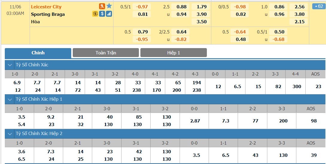 Tip kèo tỷ số hiệp 1: Leicester City 0-0 Sporting Braga
