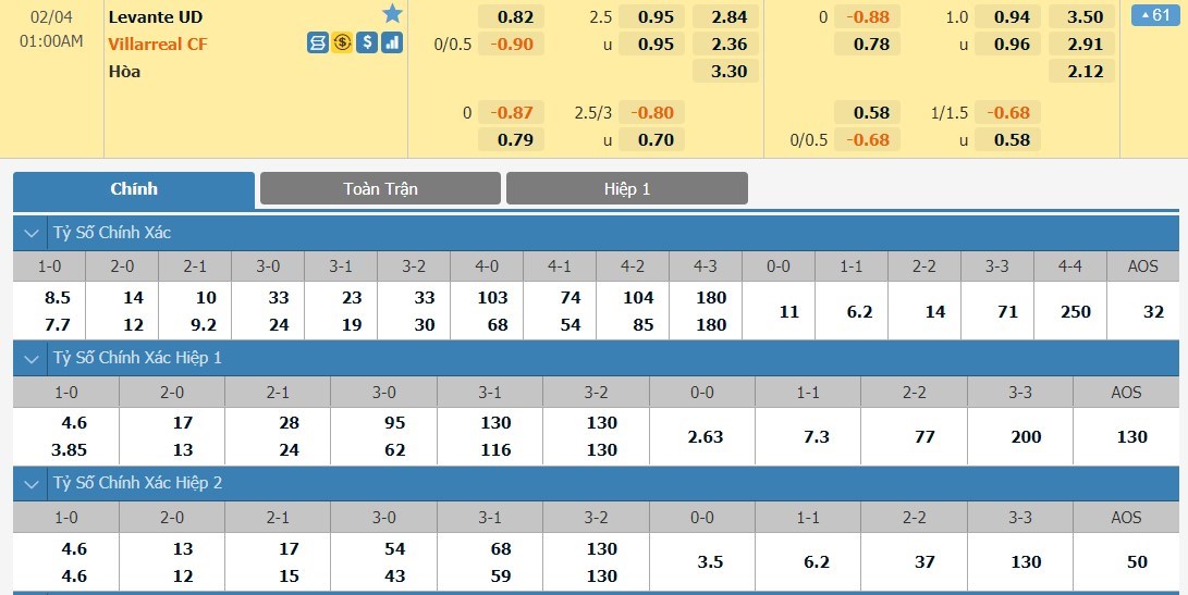 Tip kèo tỷ số hiệp 1: Levante 0-0 Villarreal