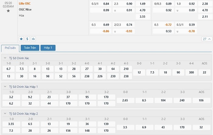 Tip kèo tỷ số hiệp 1: Lille OSC 1-1 OGC Nice