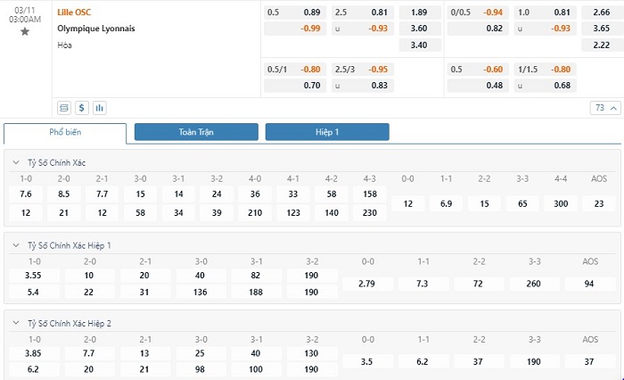 Trong 5 trận đấu gần nhất đôi bên đụng độ nhau trực tiếp, Lille đã có 3 trận đấu mang về được cho mình ít nhất là 1 bàn thắng trong hiệp đấu đầu tiên. Còn với Lyon, đội bóng này đã có 2 lần làm được điều này trong 45 phút đầu tiên. Với tỷ lệ kèo hiệp 1 là Lille chấp -1/4 trái thì người chơi nên tin tưởng vào đội khách trận này. Ở 5 lần đối đầu trực tiếp nhau thì đã có 2 trận đấu kết thúc với tổng số bàn thắng từ 3 trở lên. Các nhà đầu tư nên tin tưởng vào khả năng nổ ra cửa Tài ở cuộc đối đầu này với tỷ lệ tài xỉu là 2 1/2 trái.