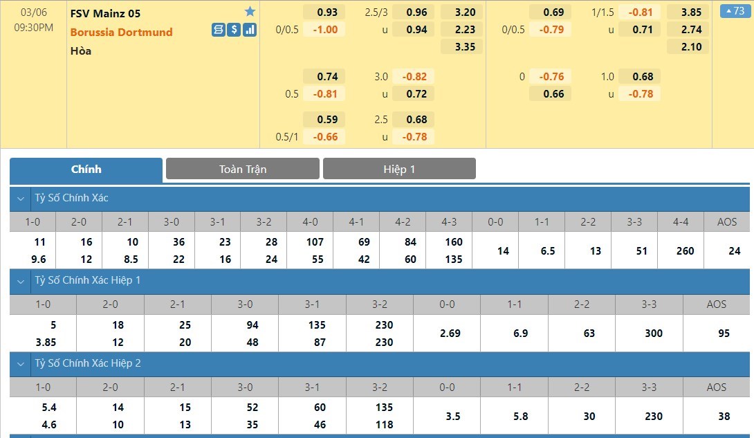 Tip kèo tỷ số hiệp 1: Mainz 05 1-1 Borussia Dortmund