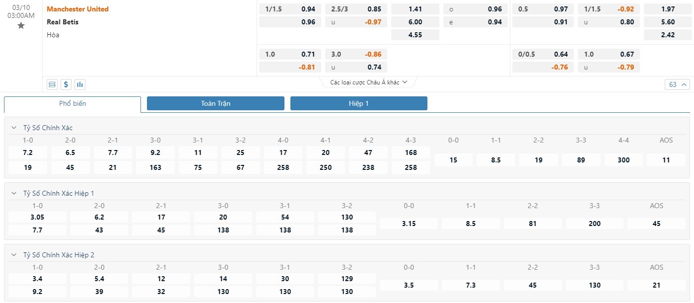 Tip kèo tỷ số hiệp 1: Manchester United 1-0 Real Betis