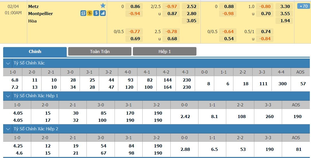 Tip kèo tỷ số hiệp 1: Metz 0-0 Montpellier