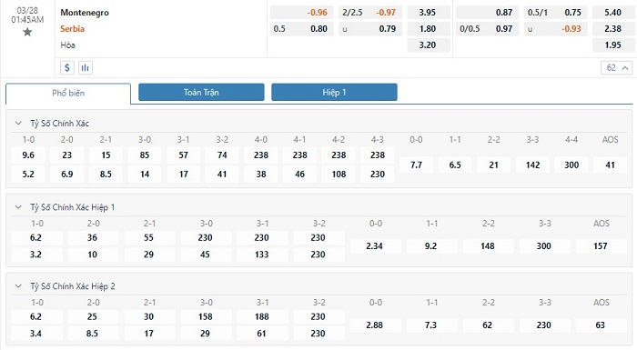 Tip kèo tỷ số hiệp 1: Montenegro 0-1 Serbia