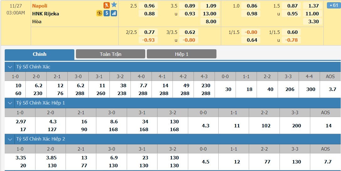 Tip kèo tỷ số hiệp 1: Napoli 2-0 HNK Rijeka