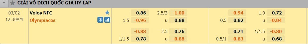 Tip kèo tỷ số hiệp 1: NFC Volos 0-0 Olympiacos
