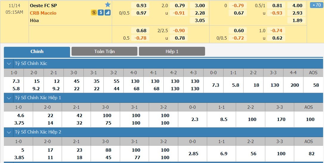 Tip kèo tỷ số hiệp 1: Oeste 0-0 CRB