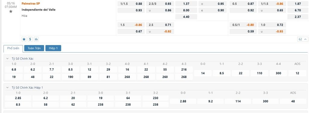 Dù rằng Ind. del Valle thắng 3/4 trận gần nhất nhưng cả 3 chiến thắng của họ đều là những thắng lợi tại giải VĐQG Ecuador. Lượt trận gần nhất tại Copa Libertadores, Ind. del Valle đã để thua 0-2 dưới tay San Lorenzo. Vì vậy mà không hề ngạc nhiên khi nhà cái xếp Palmeiras ở thế cửa trên với mốc chấp -1 1/4 trái. Nếu chơi đúng phong độ thì đội chủ nhà hoàn toàn đủ sức để tạo nên một chiến thắng cách biệt. Cả 2 lần chạm trán trước đó giữa hai đội thì phần thắng chung cuộc đều thuộc về Palmeiras.