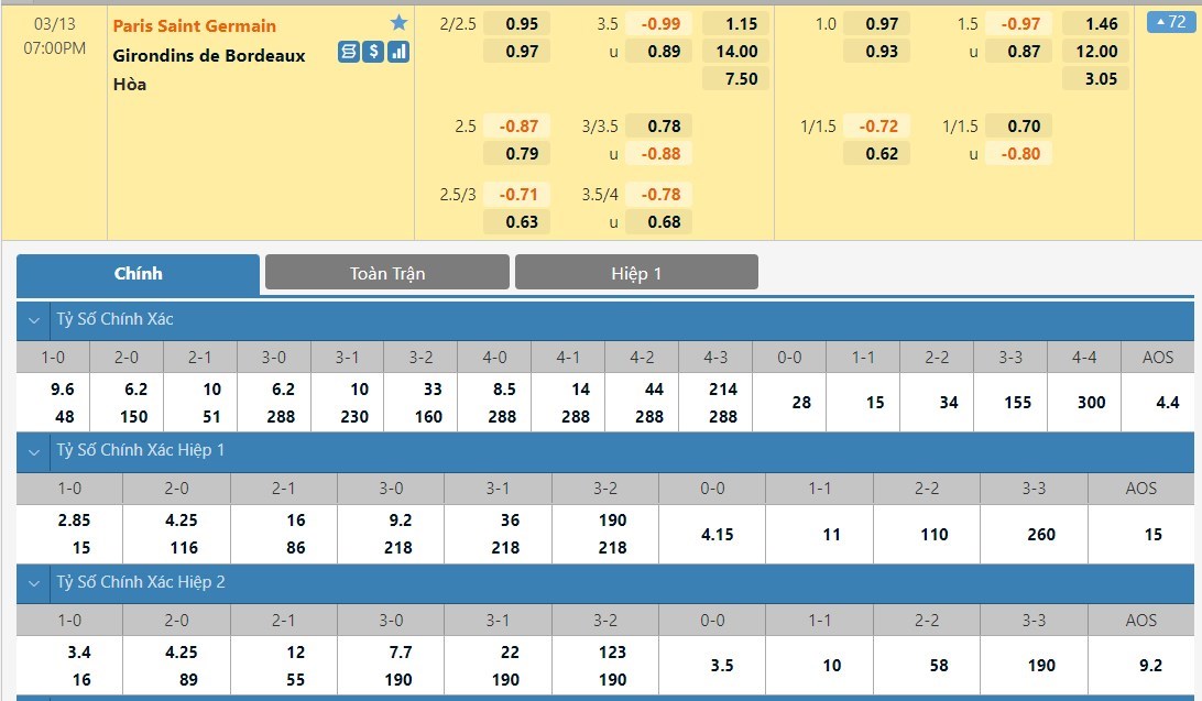 Tip kèo tỷ số hiệp 1: Paris Saint-Germain 2-0 Bordeaux