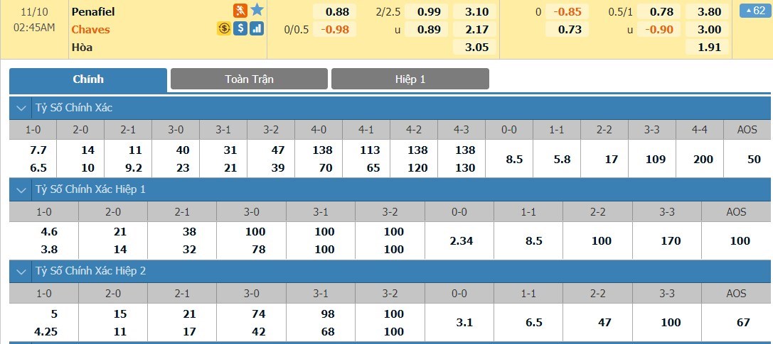 Tip kèo tỷ số hiệp 1: Penafiel 0-1 GD Chaves
