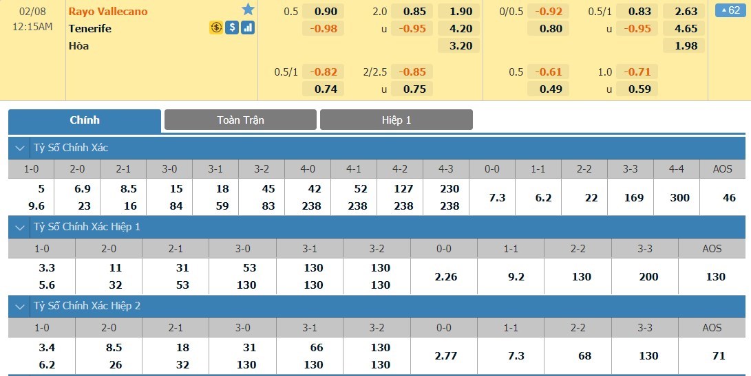 Tính trong thời gian hiệp 1, Rayo Vallecano có 5 thắng, 10 hòa và 8 lần gặp bất lợi. Con số này của Tenerife là hoàn toàn tương tự dù cho vị trí của đội bóng này kém hơn rất nhiều. Khả năng cao, 1 kết quả hòa có thể sẽ kết thúc nửa đầu trận đấu. 5 lần gần nhất làm khách trên sân của Rayo Vallecano, Tenerife chỉ có 1 thắng, 1 hòa và nhận tới 3 thất bại. Hiện tại, thành tích sân nhà là điêm tựa vô cùng quan trọng của Rayo Vallecano khi họ thắng 3 trong 5 lần gần nhất thi đấu tại thánh địa của mình. Tenerife thì đang có chuỗi 3 trận liên tiếp toàn hòa và thua. 3 điểm khả năng cao sẽ lặp lại ở trận tới.