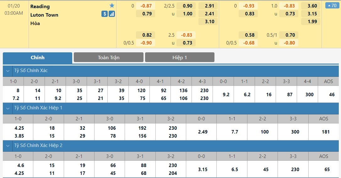 Tip kèo tỷ số hiệp 1: Reading 0-0 Luton Town