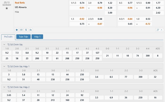 Tip kèo tỷ số hiệp 1: Real Betis 1-0 Almeria