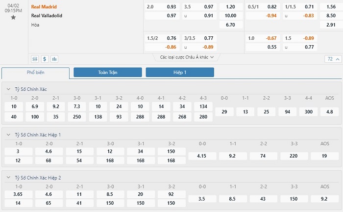 Trong 5 trận đấu gần nhất hai bên đối đầu nhau trực tiếp, Real Madrid đã có 1 trận đấu mang về được cho mình ít nhất là 1 bàn thắng trong hiệp đấu đầu tiên. Còn với Real Valladolid, đội bóng này đã không có lần nào làm được điều này trong 45 phút đầu tiên. Với tỷ lệ kèo hiệp 1 là -3/4 trái thì người chơi nên tin tưởng vào đội chủ nhà trận này. Trong 5 trận đấu gần nhất hai đội bóng này đối đầu nhau trực tiếp thì đã không có trận đấu nào kết thúc với tổng số bàn thắng từ 3 trên lên. Các nhà đầu tư nên tin tưởng vào khả năng nổ Xỉu ở cuộc đối đầu này với tỷ lệ tài xỉu là 3 1/2 trái.