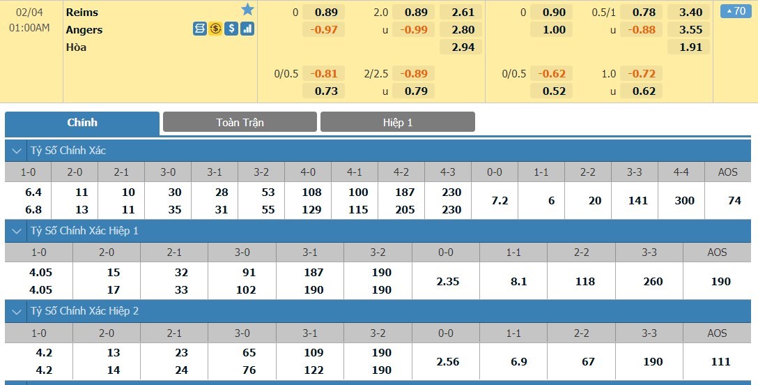 Tip kèo tỷ số hiệp 1: Reims 1-0 Angers