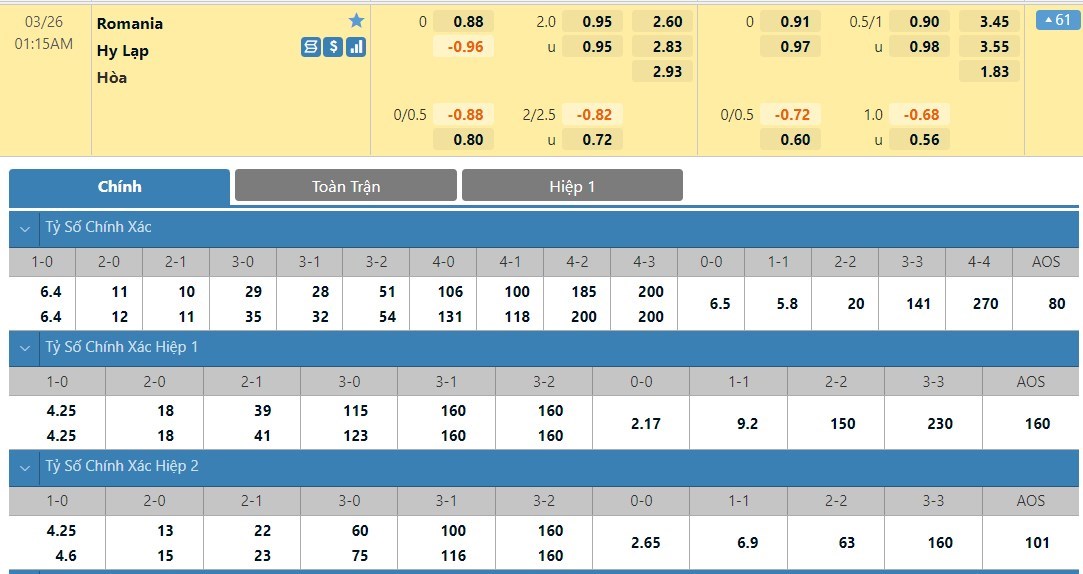 Tip kèo tỷ số hiệp 1: Romania 0-0 Hy Lạp