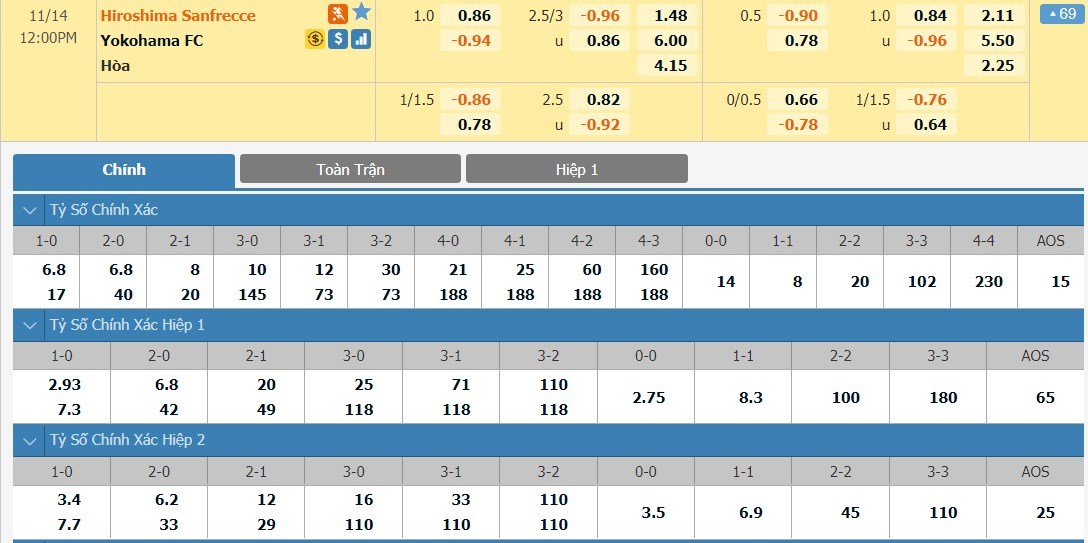 Tip kèo tỷ số hiệp 1: Sanfrecce Hiroshima 2-0 Yokohama FC