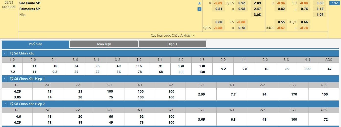 Tip kèo tỷ số hiệp 1: Sao Paulo 0-1 Palmeiras