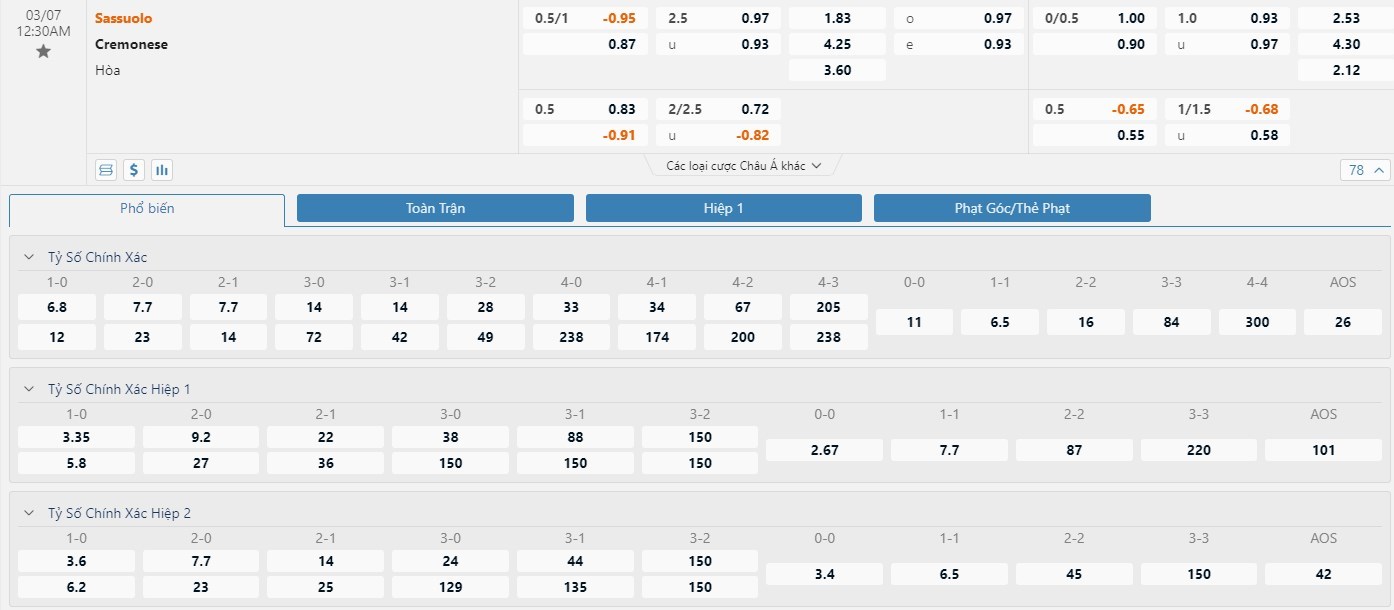 Trong 5 trận đấu gần nhất của mình, Sassuolo đã có 2 trận đấu mang về được cho mình ít nhất là 1 bàn thắng trong hiệp đấu đầu tiên. Còn với Cremonese , đội bóng này đã có 2 lần làm được điều này trong 45 phút đầu tiên. Với tỷ lệ kèo hiệp 1 là Sassuolo -1/4 trái thì người chơi nên tin tưởng vào đội khách trận này.