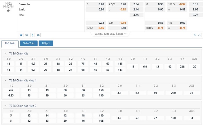 Trong 5 trận đấu gần nhất trên mọi đấu trường, Sassuolo đã mang về cho mình 9 pha lập công cùng với việc đã có 9 lần phải vào lưới nhặt bóng. Bên kia chiến tuyến, Lazio đã sở hữu 8 bàn thắng, còn lại là việc hàng thủ đã phải nhận 6 bàn thua. Các nhà đầu tư nên tin tưởng vào khả năng nổ Tài ở cuộc đối đầu này với tỷ lệ tài xỉu là 2 3/4 trái.