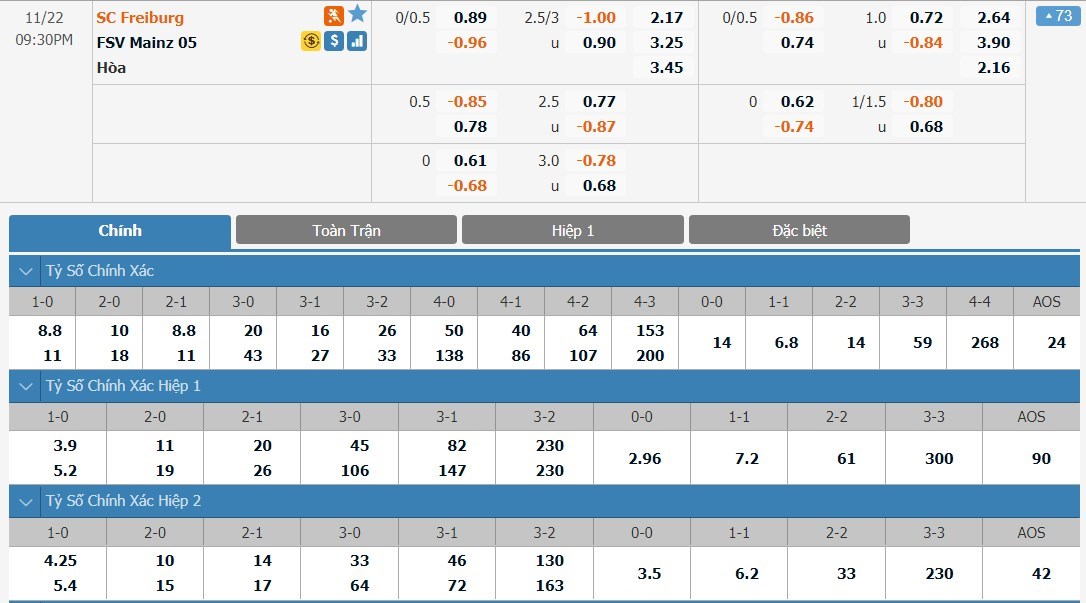 Tip kèo tỷ số hiệp 1: SC Freiburg 1-1 FSV Mainz 05