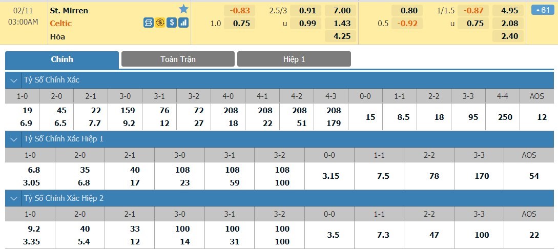 5 lần đụng độ gần nhất giữa 2 đội, St. Mirren lép vế hơn hoàn toàn khi có 1 thắng lợi và nhận tới 4 thất bại trước Celtic. St. Mirren có sự bất ổn lớn khi cũng có tới 10 lần kết thúc 45 phút đầu tiên với việc bị dẫn trước. Trong khi đó, Celtic có 13 thắng, 10 hòa và 3 thua nếu chỉ tính trong thời gian hiệp 1. Rất có thể, Celtic với tâm lý thoải mái sẽ tạo ra hiệp 1 bùng nổ ở trận đấu tới.