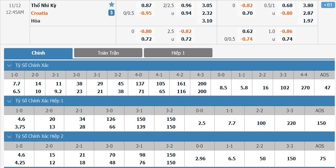 Tip kèo tỷ số hiệp 1: Thổ Nhĩ Kỳ 0-0 Croatia