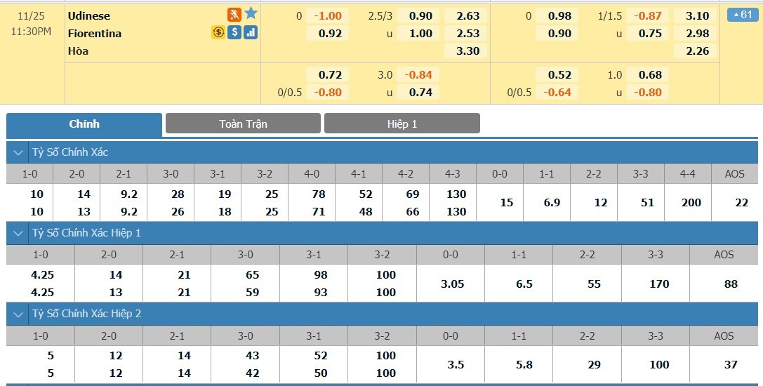 Tip kèo tỷ số hiệp 1: Udinese 0-0 Fiorentina