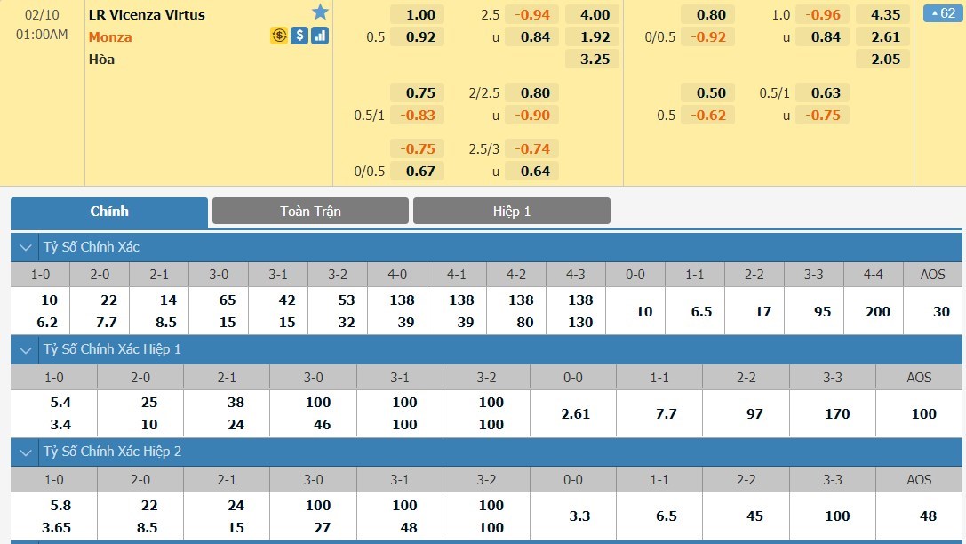 Dù có vị trí khác nhau hoàn toàn nhưng cả 2 đội cùng có cách nhập cuộc tương đồng. 45 phút đầu tiên trôi qua, Vicenza Virtus có cho mình 10 kết quả hòa còn với Monza con số này là 11. Chính vì thế, khả năng cao ta sẽ có kết quả bất phân thắng bại khi bước vào giờ nghỉ trận tới.