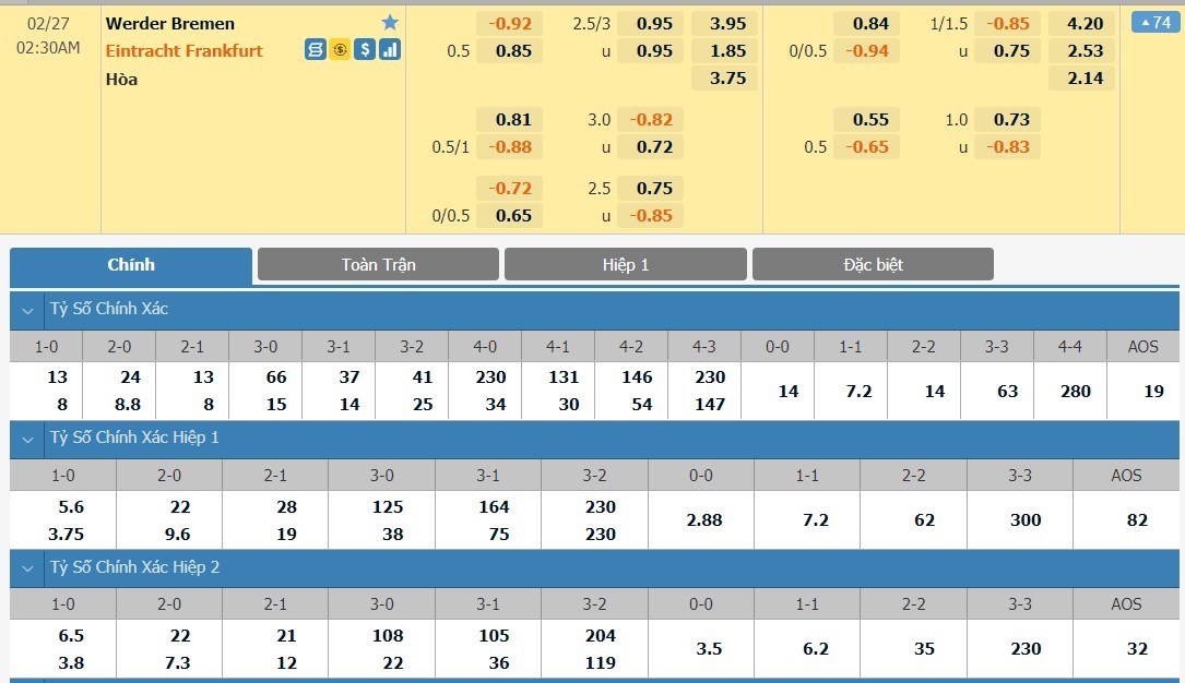Sự chênh lệch đã được nhà cái thể hiện qua việc đưa ra mốc chấp -1/2 bàn dẫu cho Eintracht Frankfurt là đội chịu bất lợi về mặt yếu tố sân bãi. Nhìn lại quá khứ, 4 lần gần nhất làm khách trên sân của Werder Bremen, Eintracht Frankfurt có 2 thắng, 1 hoà và 1 thất bại. Werder Bremen chỉ có thể có 2 thắng lợi trong 10 trận sân nhà trước đó. Chính vì thế, tỷ lệ Eintracht Frankfurt -0,5 bàn sẽ là 1 lựa chọn an toàn.