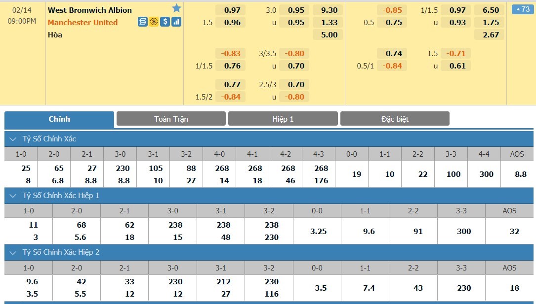 Tip kèo tỷ số hiệp 1: West Bromwich 0-1 Manchester United