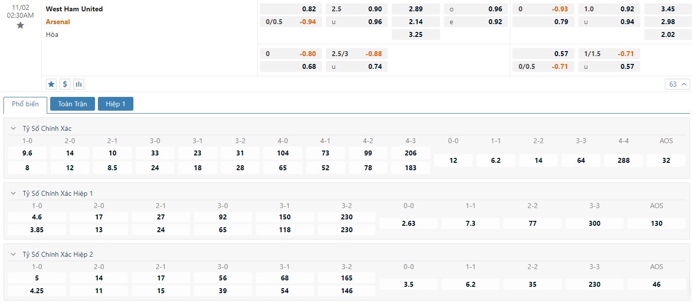 Tip kèo tỷ số hiệp 1: West Ham 0-1 Arsenal