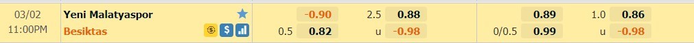 Tip kèo tỷ số hiệp 1: Yeni Malatyaspor 0-0 Besiktas